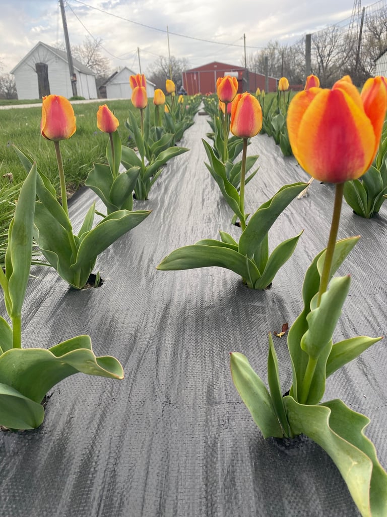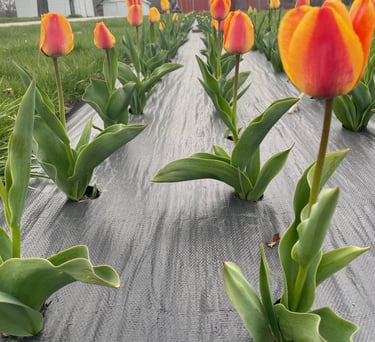 In preparation for the 2026 season we are doubling down and planted over 1,000 more tulips bulbs. Tulip season is anywhere late March - early May with a short blooming window of only a few weeks. Because their bloom is short and contingent on the weather, we will keep a close eye and announce picking dates and Spring Flower Festival dates as we can!